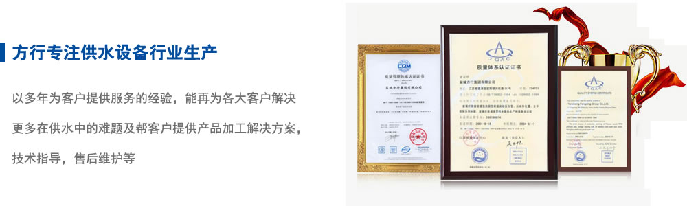 鹽城方行集團有限公司創建于一九七七年,四十多年來,在各級領導、國家行業協會和大專院校的大力支持幫助下,現已發展成為一家集研發、設計、生產、銷售、安裝、服務于一體的給排水設備企業。產品優良,注重品牌。本公司先后榮獲“明星企業”、“中國鄉鎮明星企業”、“中國馳名品牌”等榮譽稱號。“方行”牌玻璃鋼夾砂管道、水箱被江蘇省建設廳指定為推廣產品;污水處理設備被專家評定為國家級新產品;方行牌玻璃鋼夾砂管道、玻璃鋼貯罐、一體化預制泵站、生活、消防箱泵一體化、污水處理設備、玻璃鋼水箱、不銹鋼水箱等產品先后被評為鹽城市名牌產品,江蘇省優質產品,江蘇省名牌產品。公司技術和售后服務日臻完善。在同行中享有很高的知名度、美譽度。以信為本,廣拓業務。本公司始終恪守“持之以恒、誠信為本”的經營宗旨,持續發揚自強不息,順勢而上,趨利避弊,不斷推動產品發展,為我國的給排水工業,為我們的民族工業品牌的發展而做出自己的貢獻。堅持革新,與時俱進。公司一貫跟隨社會的發展堅持不斷革新、嚴謹規劃、精益求精的質量方針。公司著重于環保新技術及給排水設備的創新研發,已擁有多項國家專利技術。